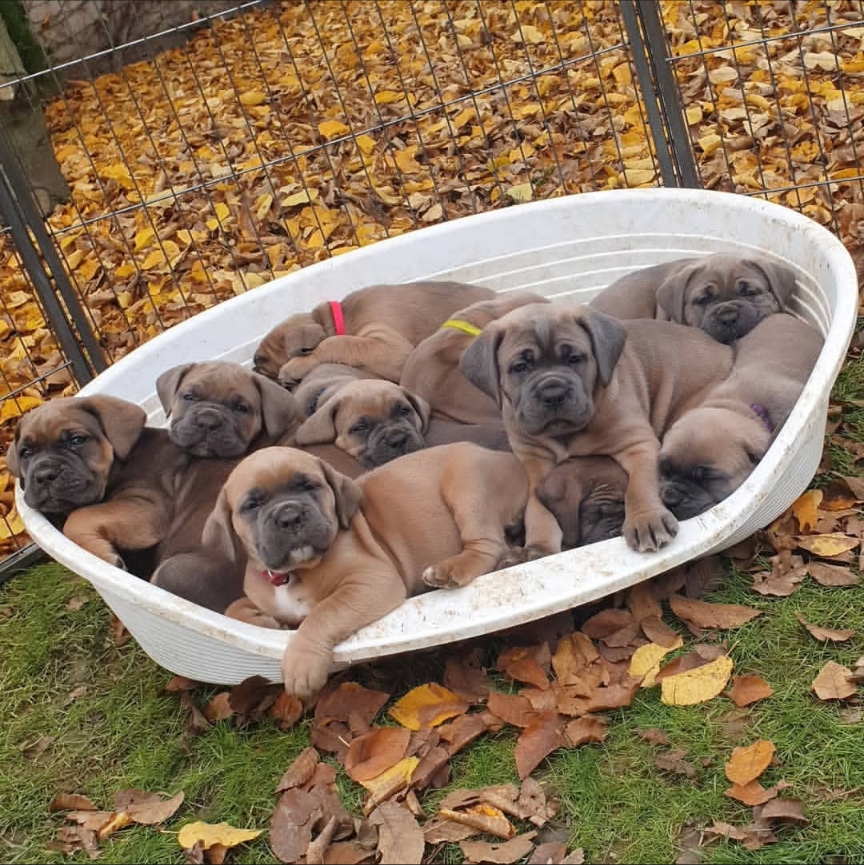 Obedience begins with recall. Our Cane Corso puppies are first introduced to simple sound associations — such as a whistle, kiss, or snap — which they quickly learn to connect with food rewards. This early conditioning follows the principles proven by Pavlov, helping pups understand the vital “Come” command as soon as they begin eating solid food. We pair the whistle with their name and the command “Come,” rewarding them with a tasty treat once they reach us.